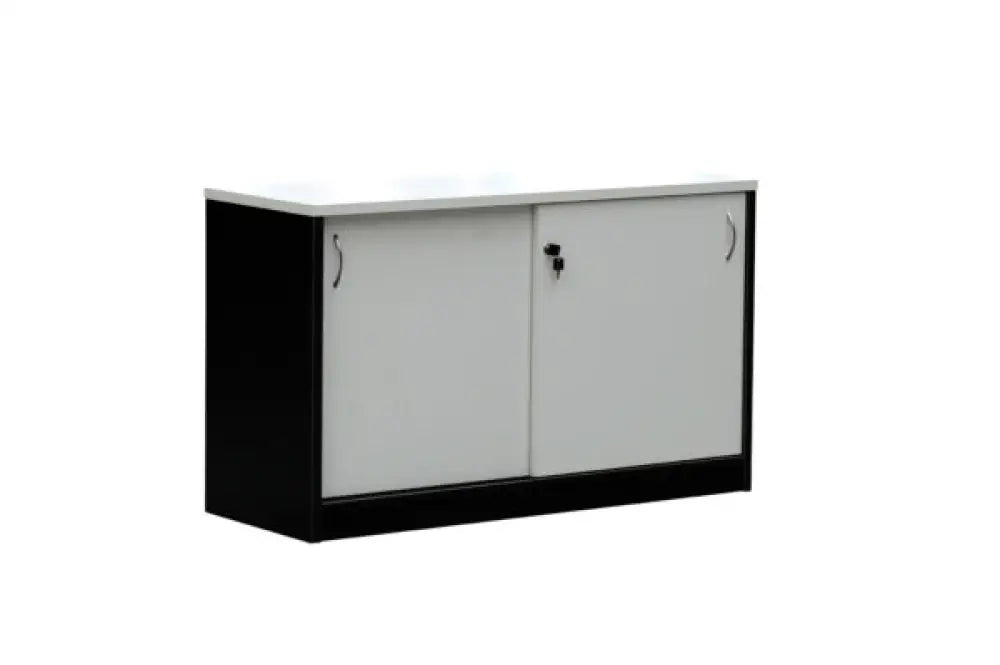 Perfect for compact office spaces, the Orion 1200W Credenza offers secure storage in a clean, modern form. With lockable doors, adjustable shelving, and chrome detailing, it blends functionality with refined design.