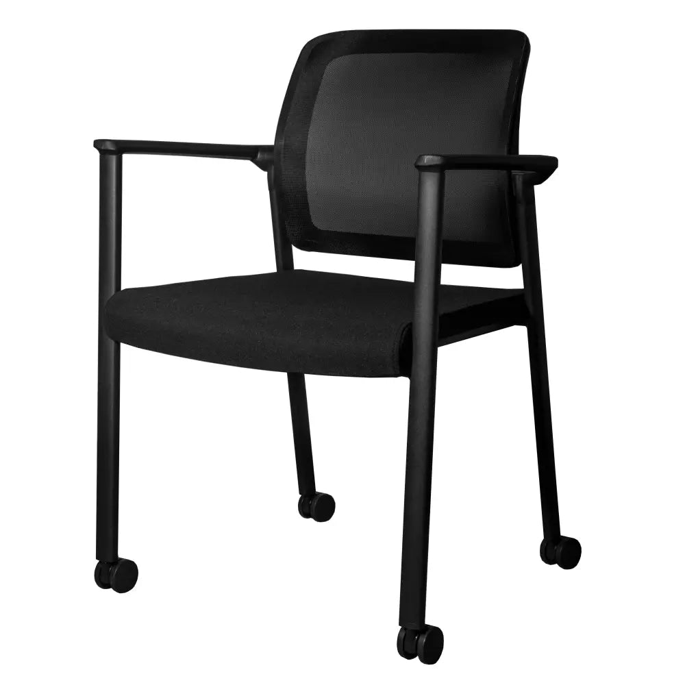 Spring loaded back for extra support and comfort. Option with or without castors. Heavy duty weight rating 135kg. Available with arms only. Standard in black fabric, mesh and frame. Can be recovered in COM.